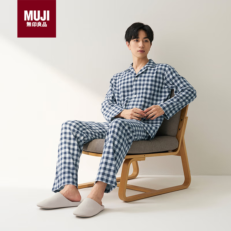 百亿补贴:无印良品(MUJI)[自营限定款]男士无侧缝 双层纱织睡衣 软棉棉内衣 藏青色格纹 M