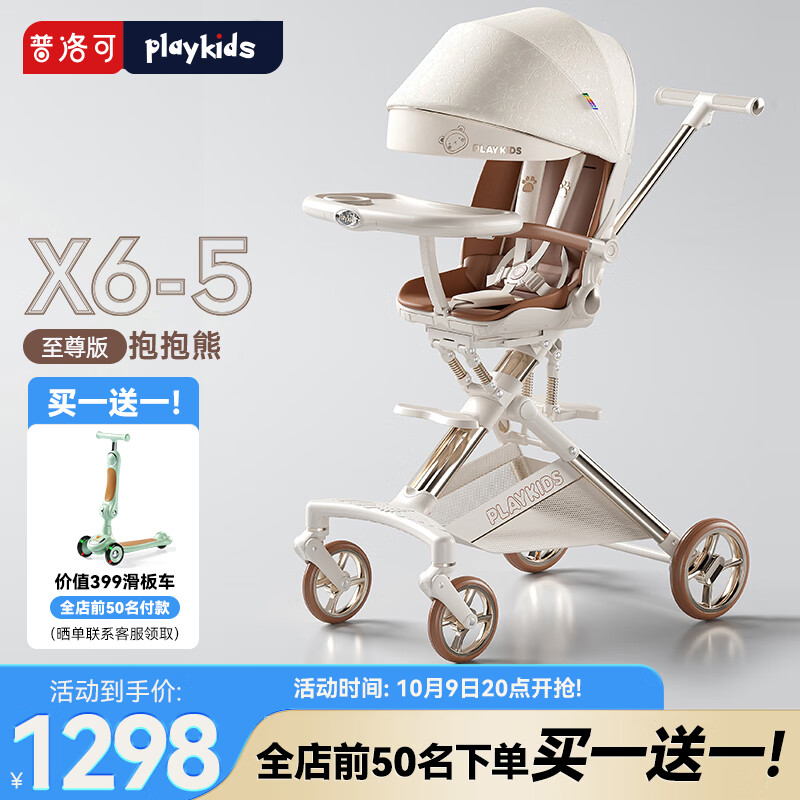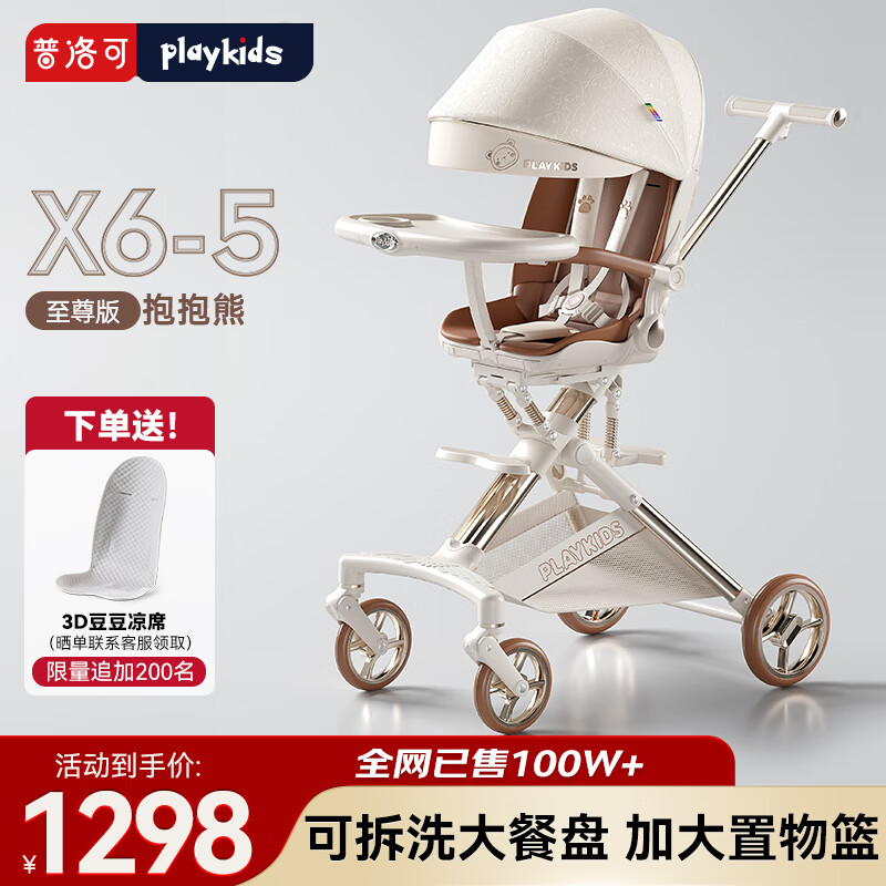 普洛可(PLAYKIDS)X6-5遛娃神器推车带餐盘换向轻便高景观溜娃可坐可躺易折叠婴儿车 X6-5抱抱熊至尊版(带餐盘)