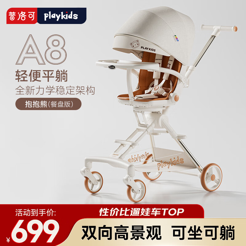普洛可(PLAYKIDS)A8max遛娃神器推车婴儿车0-3岁用折叠可坐可躺带减震轻便溜娃车 A8抱抱熊(带餐盘)