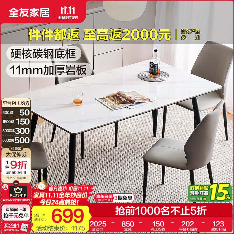 全友家居现代简约风餐桌岩板台面一桌四椅餐吃饭桌椅子长条桌政府补贴 【岩板】1.2m餐桌+幻影餐椅*4 食品级岩板+三重承托+双层台面+碳钢框架