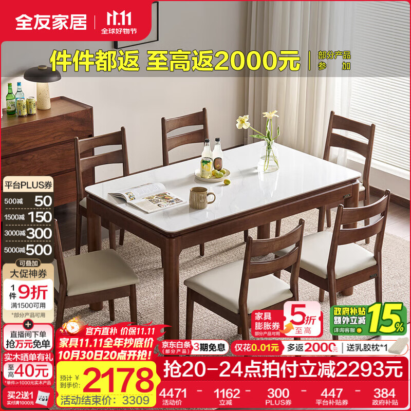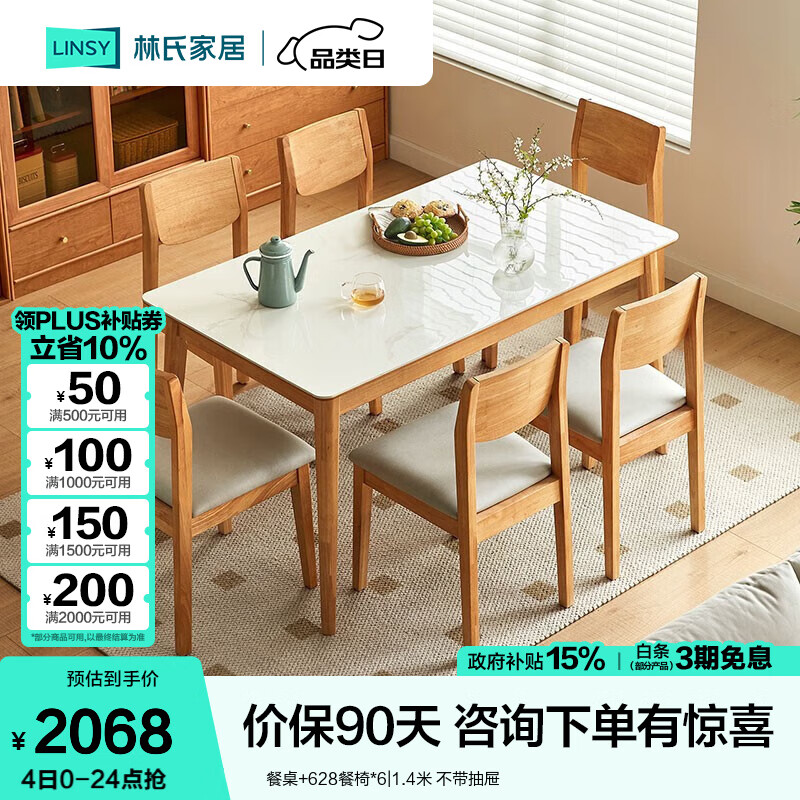 林氏家居实木餐桌椅组合国家补贴岩板餐桌家用四方桌子欧式饭桌家具LH628 【原木色】餐桌+628餐椅*6 1.4米 不带抽屉