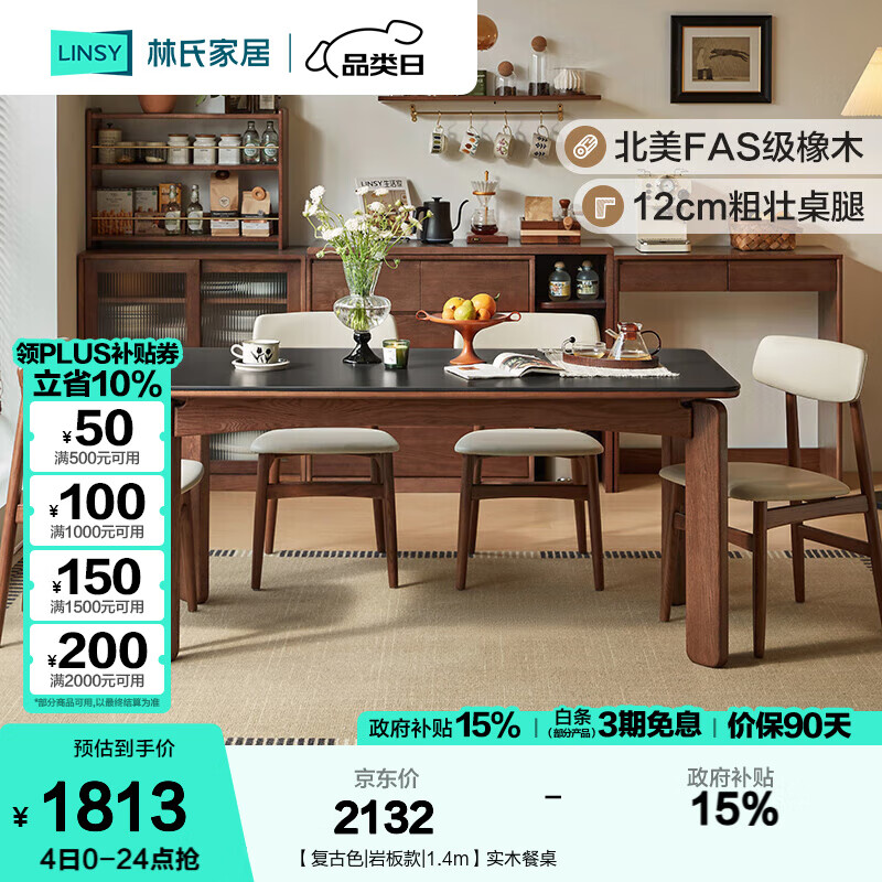 林氏家居复古实木餐桌岩板餐桌家用大板吃饭桌子餐椅组合可可系列LH586R1 【复古色|岩板款|1.4m】实木餐桌