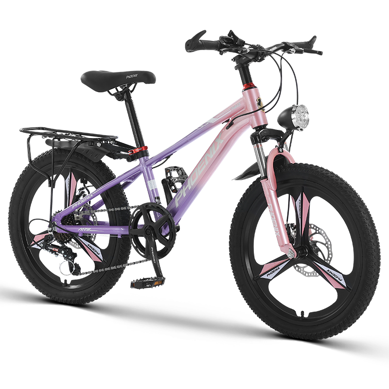 百亿补贴:凤凰官方旗舰店儿童自行车男女变速青少年学生山地车碟刹赛车 星际 粉紫【变速】后座+LED灯+三刀轮 20寸【适合125-160cm】