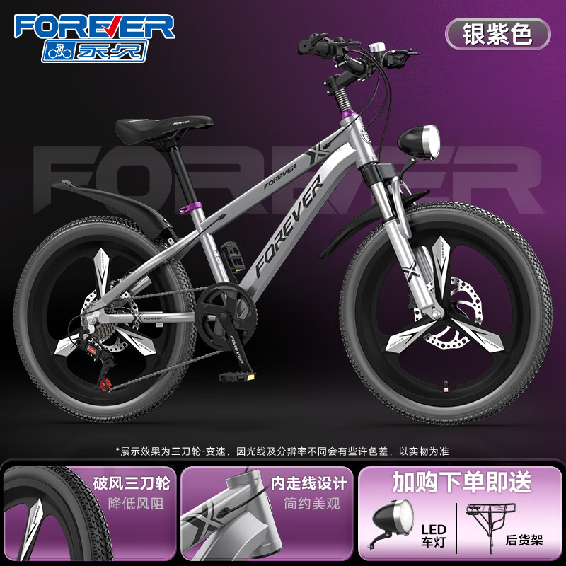 百亿补贴:永久(FOREVER)儿童自行车女学生6-12岁到18岁山地车男女小孩变速碟刹青少年大童 银紫【三刀轮】钢架+后座+LED灯 【22寸丨变速】适合140-170cm