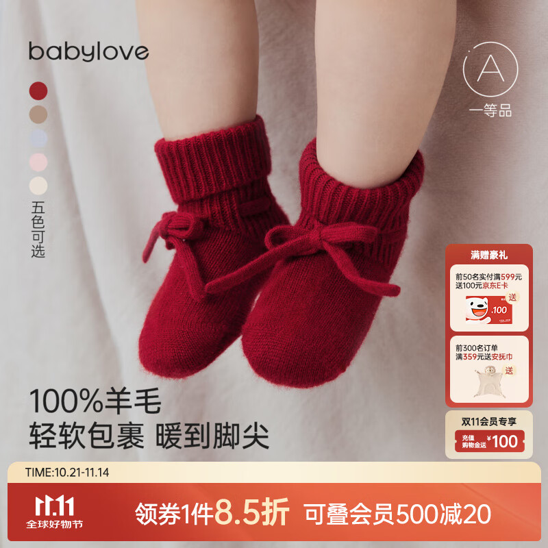 babylove宝宝脚套秋冬100%绵羊毛针织婴儿鞋套新生儿保暖护脚鞋袜 微醺红 0-6月 (10.5cm)