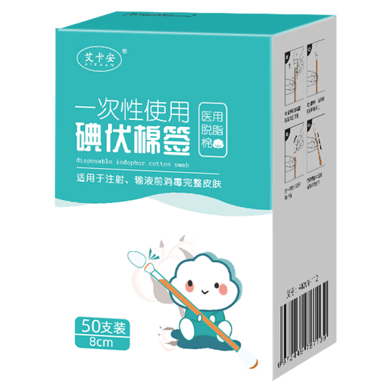 艾卡安医用碘伏棉签无菌碘酒消毒液棉签婴儿护脐带肚脐碘酊双头8cm*50支