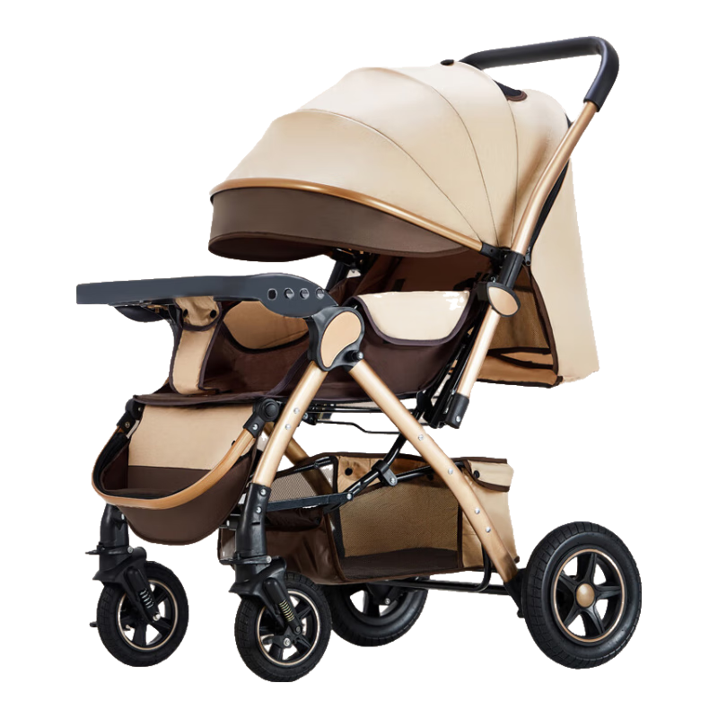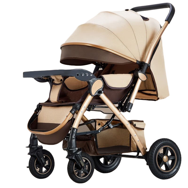 安贝尼 婴儿推车可坐可躺双向推行小孩手推车四轮减震可折叠BB车 至尊版-卡其色四轮橡胶+四轮减震