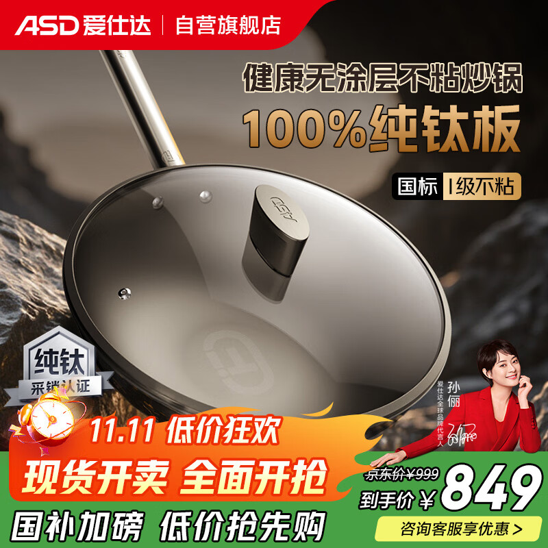 爱仕达(ASD)炒锅纯钛炒锅无涂层炒菜锅钛锅不粘锅32cm燃气电磁炉通用CT32Z6Q