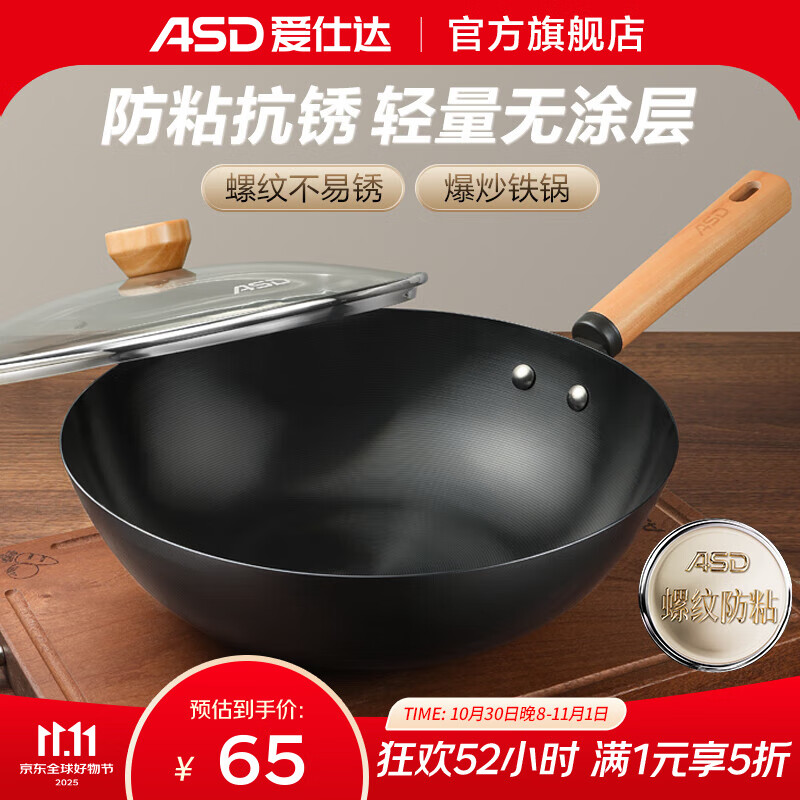 爱仕达(ASD)炒锅铸铁锅厨房家用无涂层锈不了平底炒菜锅电磁炉燃气灶明火通用 大视窗铸铁炒锅 32cm