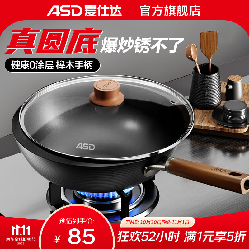 爱仕达(ASD)炒锅锈不了铸铁锅厨房家用无涂层平底炒菜锅电磁炉燃气灶明火通用 大视窗铸铁炒锅 34cm