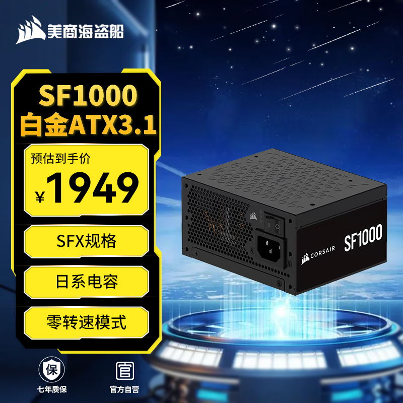 美商海盗船(USCORSAIR)SF1000 1000W电源 SFX尺寸 白金认证 全模组 ATX 3.1/PCIe 5.1 全日系电容 低噪音