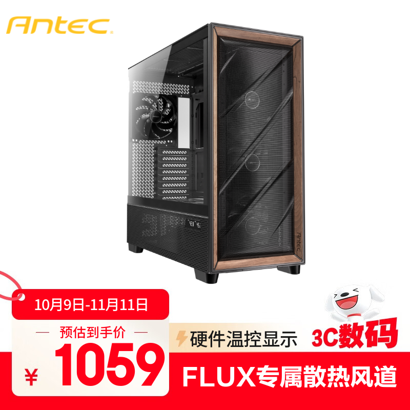 安钛克(Antec)FLUX PRO电脑主机箱/胡桃木外观//FLUX风道专利/双温控显示/配6把风扇 /侧装电源/玻璃