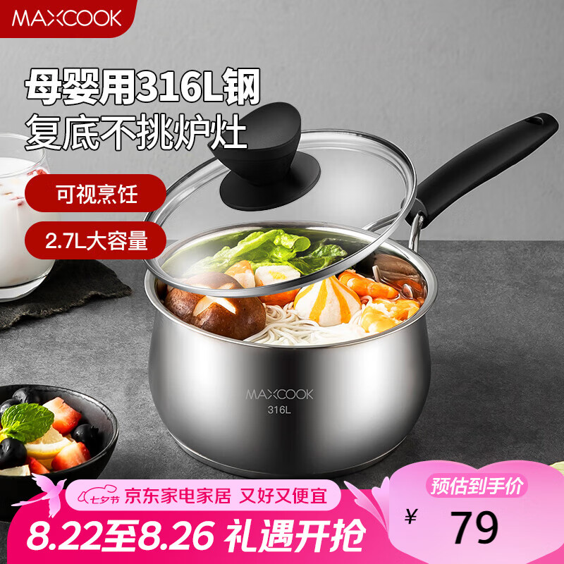 美厨(maxcook)316L不锈钢奶锅汤锅18cm 泡面煮奶辅食锅加厚复合底 MCN8129