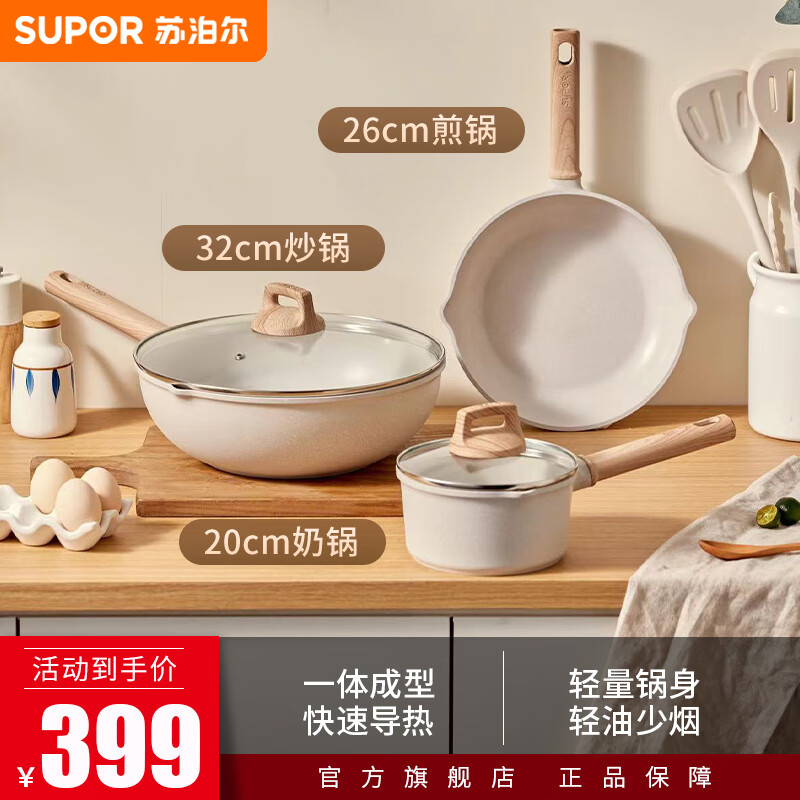 苏泊尔(SUPOR)锅具套装麦饭石色不粘套装锅家用白色酷石汤锅电磁炉燃气适用 【32炒锅+26煎锅+20奶锅】三件套