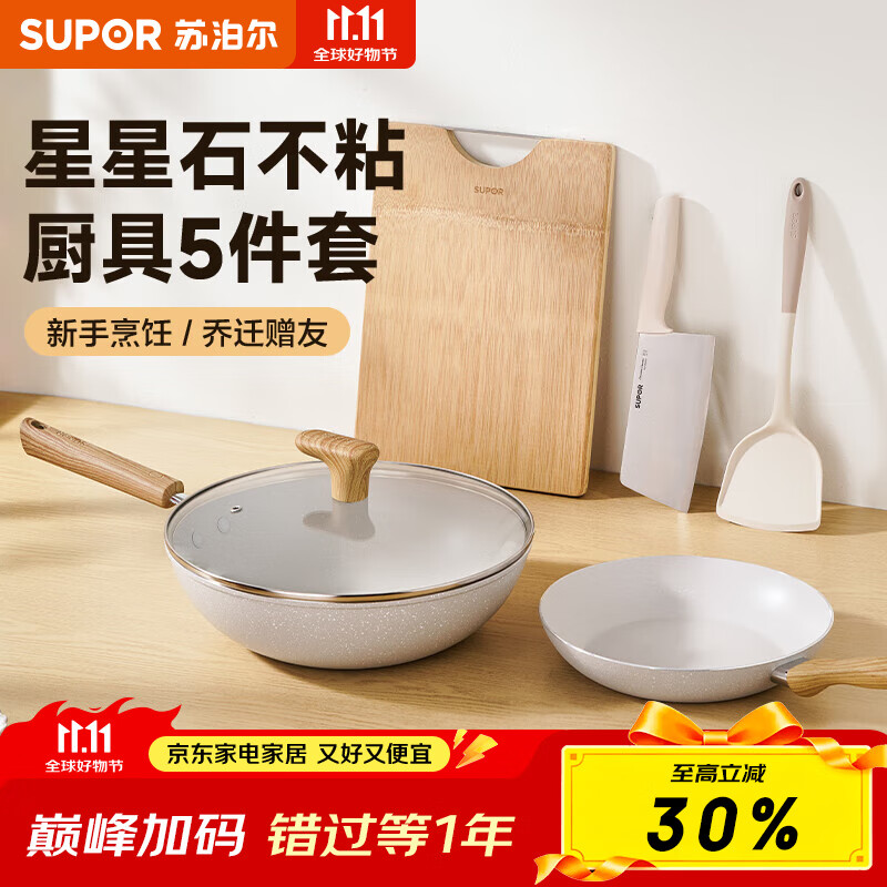 苏泊尔(SUPOR)锅具套装星星石不粘锅炒锅煎锅奶锅汤锅加深锅型耐磨耐用 不粘五件套【煎炒锅+刀板铲】