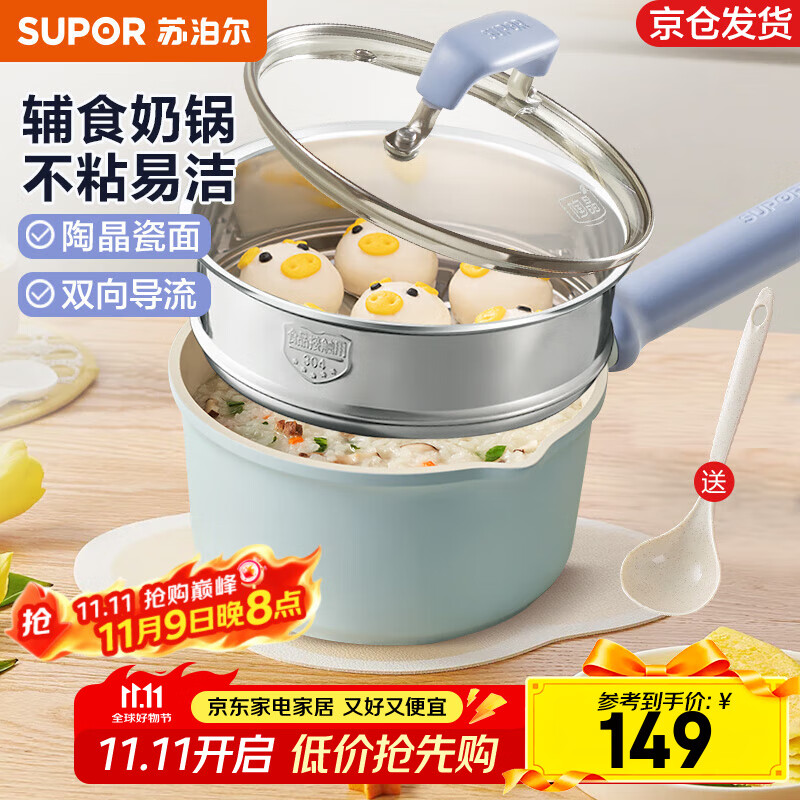 苏泊尔(SUPOR)奶锅陶瓷不粘小锅婴儿热奶锅宝宝辅食锅多用泡面锅燃气电磁炉通用 +蒸格【适合1-3人使用】 18cm