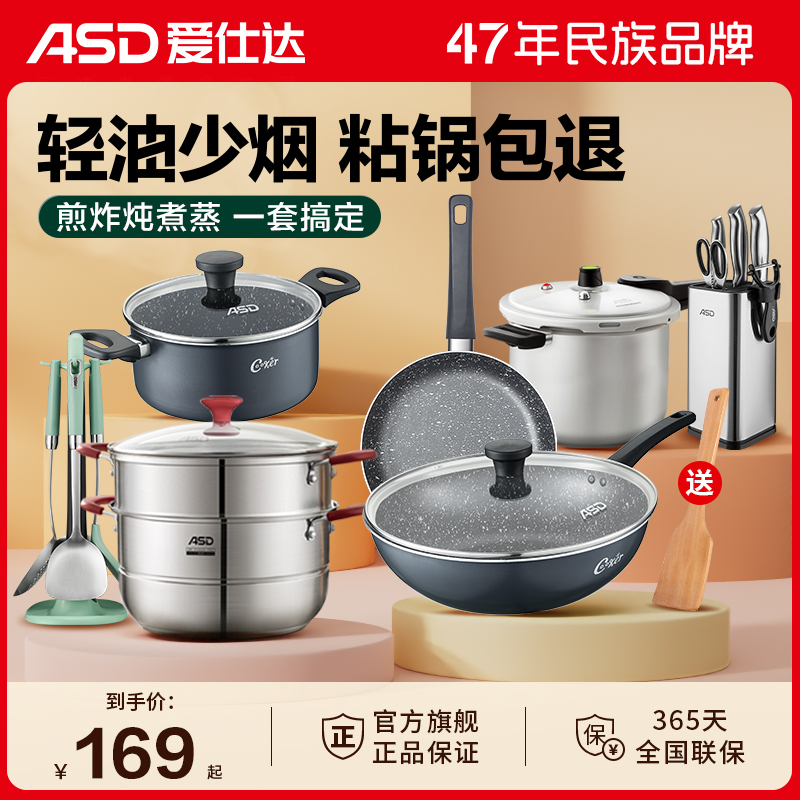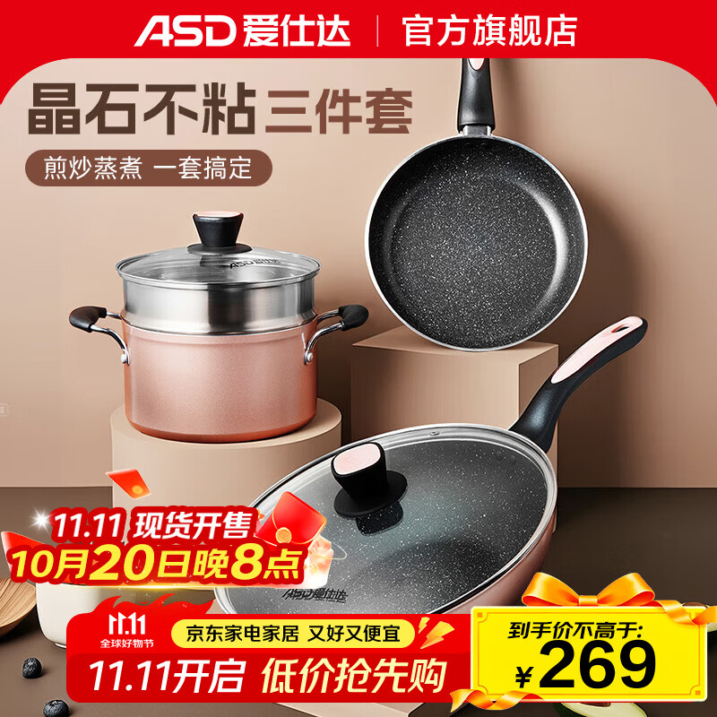 爱仕达(ASD)【自营店铺】锅具套装不粘炒锅煎锅汤锅带蒸屉套装锅明火磁通厨具套装 3件套