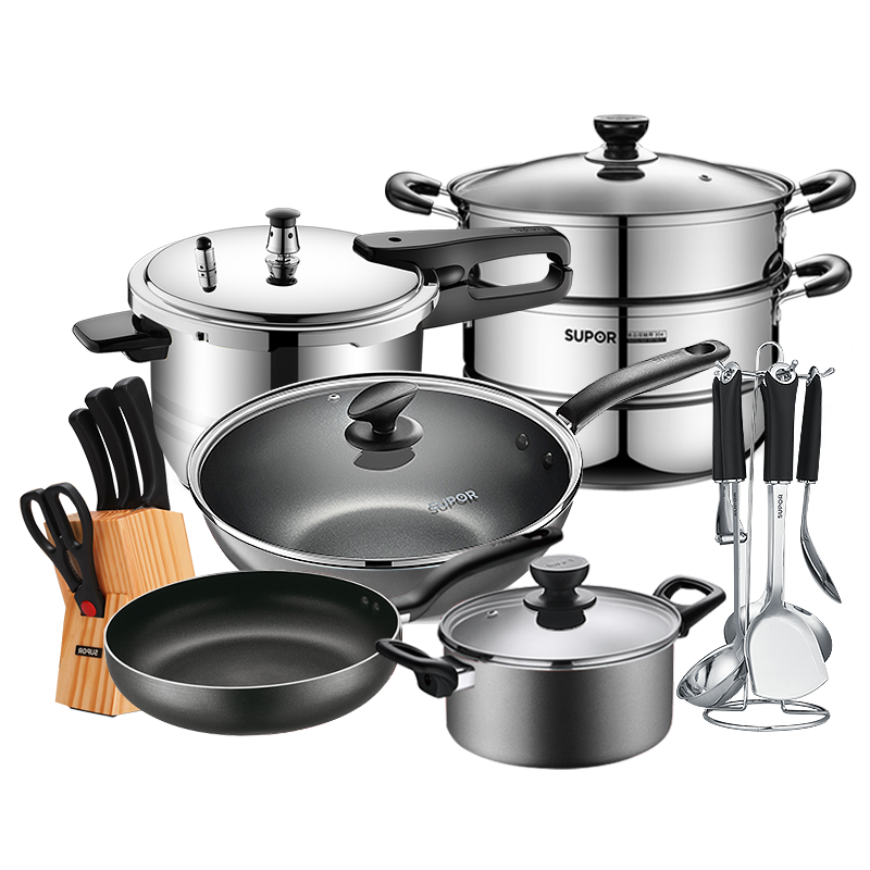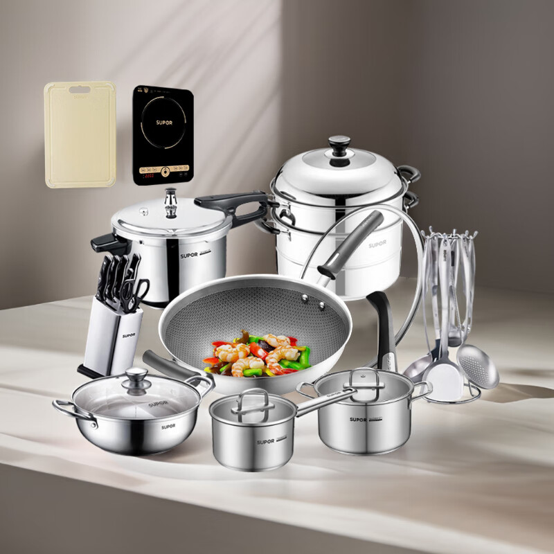 苏泊尔(SUPOR)厨具套装不锈钢锅具套装炒锅火锅汤奶锅压力锅蒸锅套刀套铲勺菜板 精品22件套