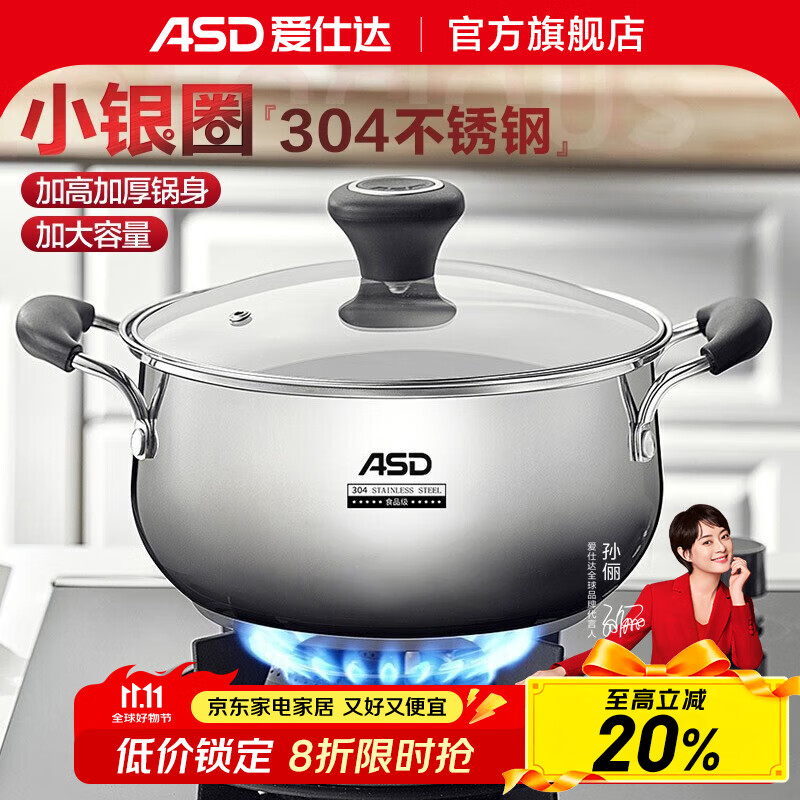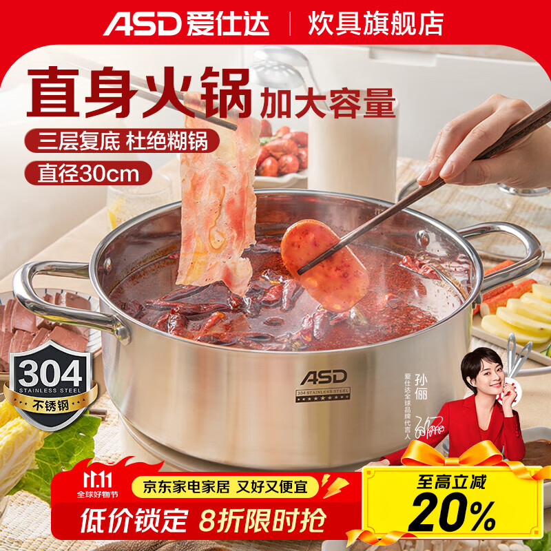 爱仕达(ASD) 火锅304不锈钢直身大容量火锅汤锅厨房家用客厅涮锅电磁明火通用 旋风复底清汤火锅 30cm