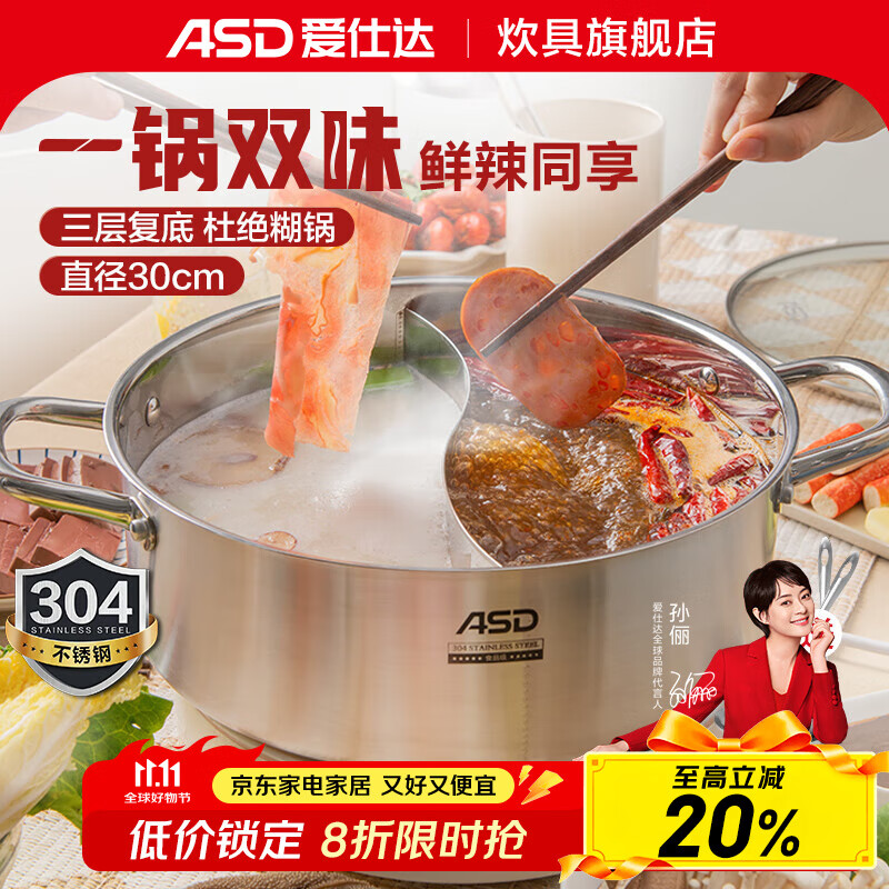 爱仕达(ASD) 火锅304不锈钢直身大容量火锅汤锅厨房家用客厅涮锅电磁明火通用 旋风复底鸳鸯火锅 30cm