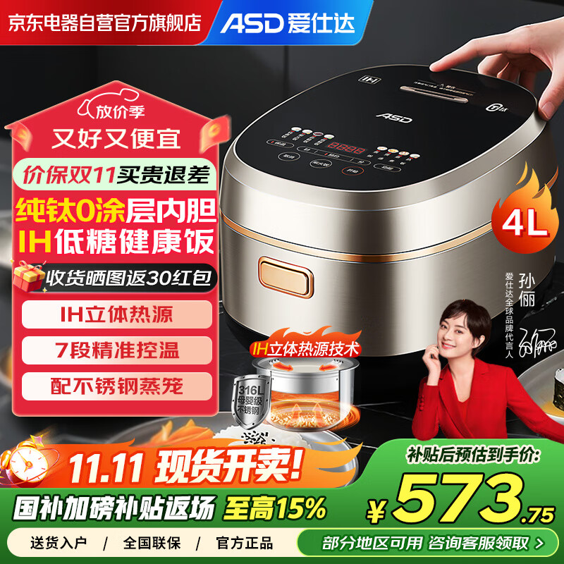 爱仕达(ASD)纯钛IH低糖健康0涂层电饭煲4L大容量无涂层1-8人蒸煮炖煲汤多功能智能不锈钢电饭锅 AR-F40I862