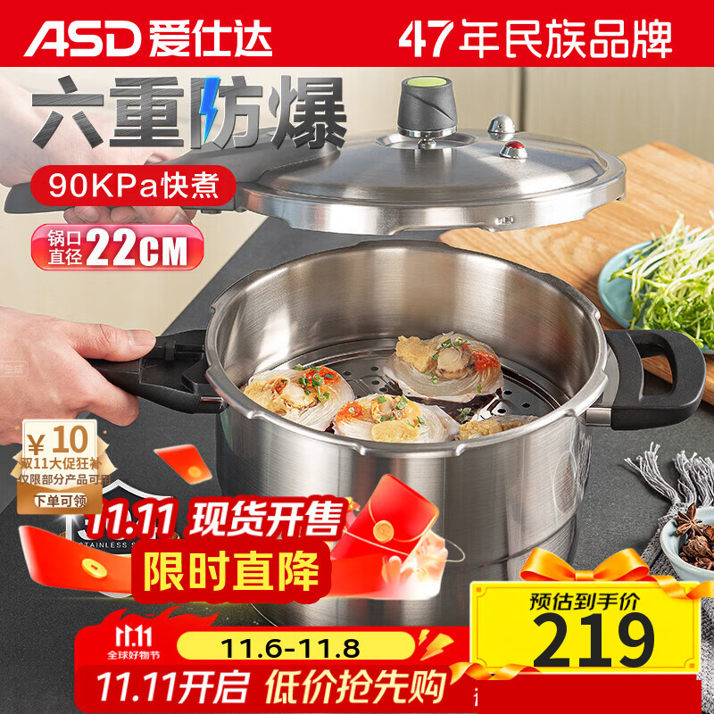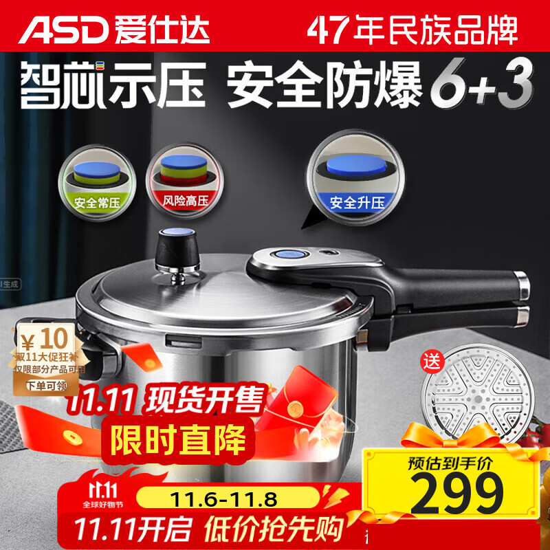 爱仕达 ASD 高压锅燃气电磁炉通用T型6.0L六保险不锈钢压力锅YS22T3WG