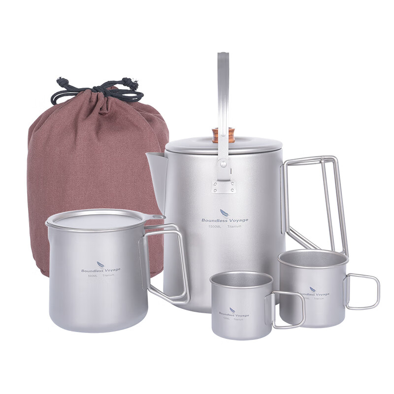 必唯(BOUNDLESS VOYAGE)纯钛户外咖啡壶1500ml折叠手柄便携露营咖啡杯野营烧水壶单层 Ti3129D咖啡壶+公道杯+2咖啡杯