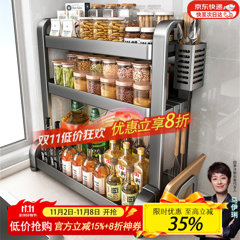 四季沐歌厨房调料置物架厨房用具大全台面调料收纳放调料储物架筷筒砧板架 枪灰全配-3层34cm【升级加粗】