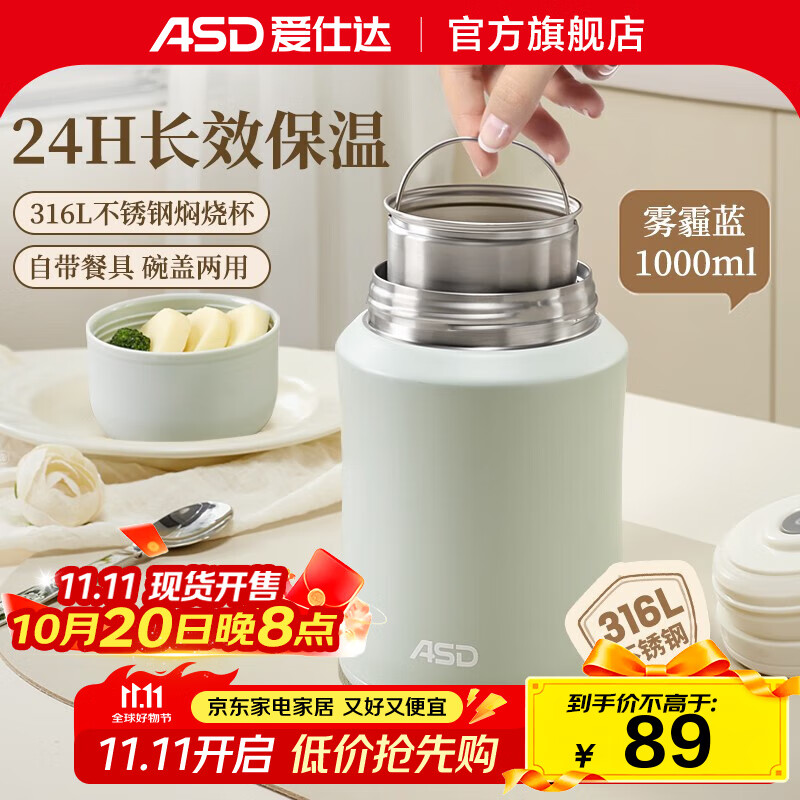 爱仕达焖烧杯316不锈钢L上班族带饭大容量焖粥罐便当餐盒女学生保温饭盒 1000ml 雾霾蓝
