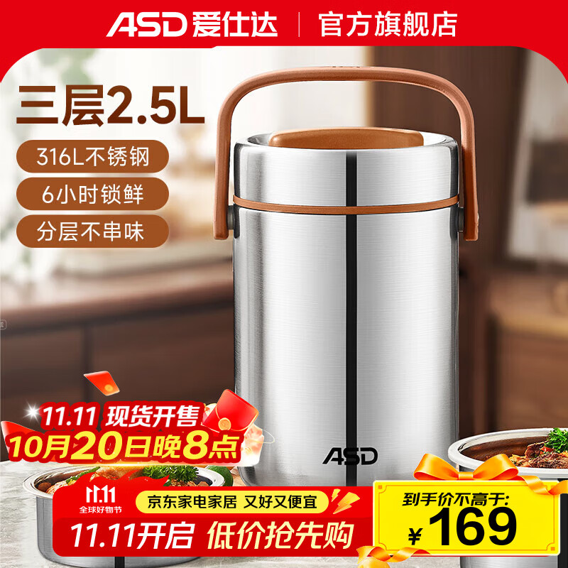 爱仕达(ASD)保温饭盒 316L不锈钢真空保温提锅大容量上班族带饭多层餐盒桶 【升级款316L】 3层 2.5L