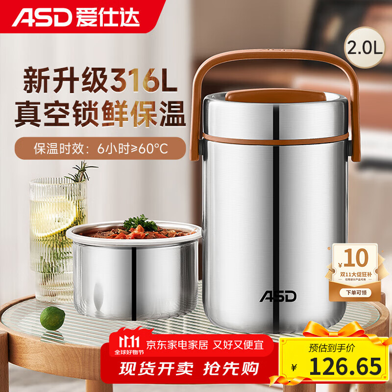 爱仕达(ASD)饭盒保温提锅316L不锈钢真空保温桶2.0L便携保温便当盒RWS20T10WG