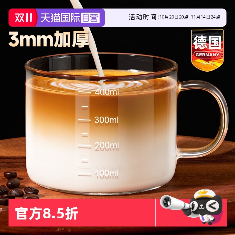 圆形刻度玻璃杯【400ml】带把手 德国玻璃早餐牛奶杯微波炉可加热