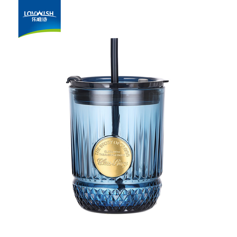 NERVISHI墨蓝高颜值玻璃杯ins风咖啡杯家用ins风果汁杯子带盖可乐吸管水杯 可乐钻纹吸管杯【金色印章】450ml*1