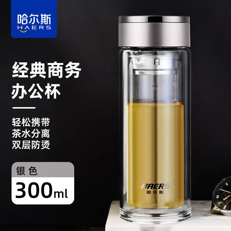哈尔斯茶水分离杯泡茶玻璃水杯子男女士双层防烫便携车载商务家用耐高温 银色300ml
