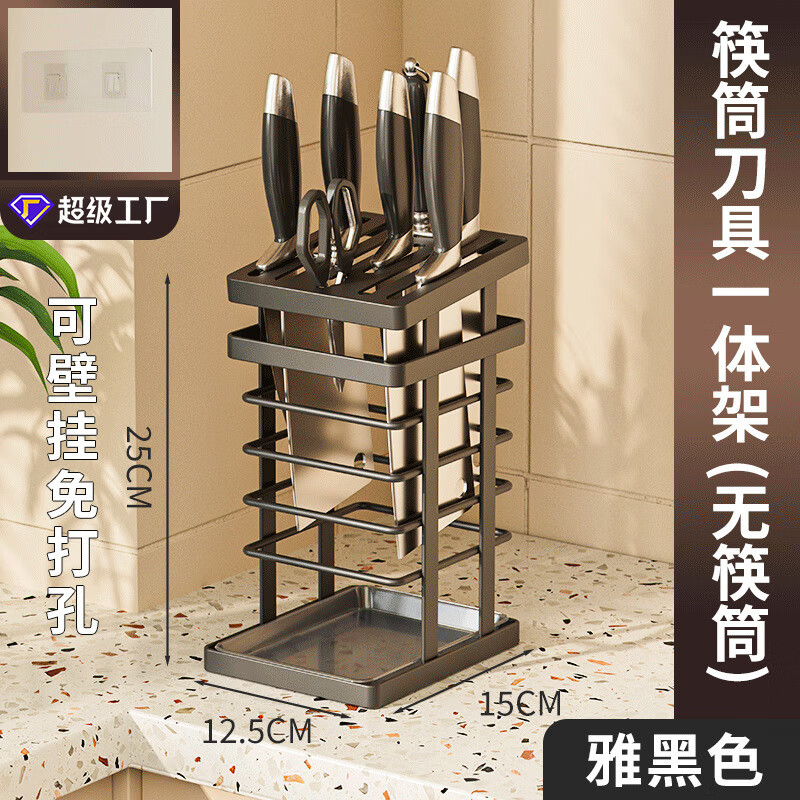 礼奈厨房免打孔刀架台面带沥水盘置物架多功能壁挂式筷子筒勺筒收纳架 雅黑色斜面刀架-无筷筒