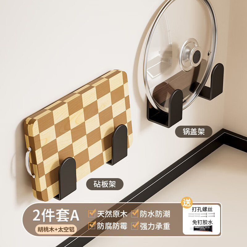 礼奈胡桃木厨房置物架中古风免打孔壁挂式多层锅盖刀筷勺调料收纳架子 胡桃木厨房挂架两件套A