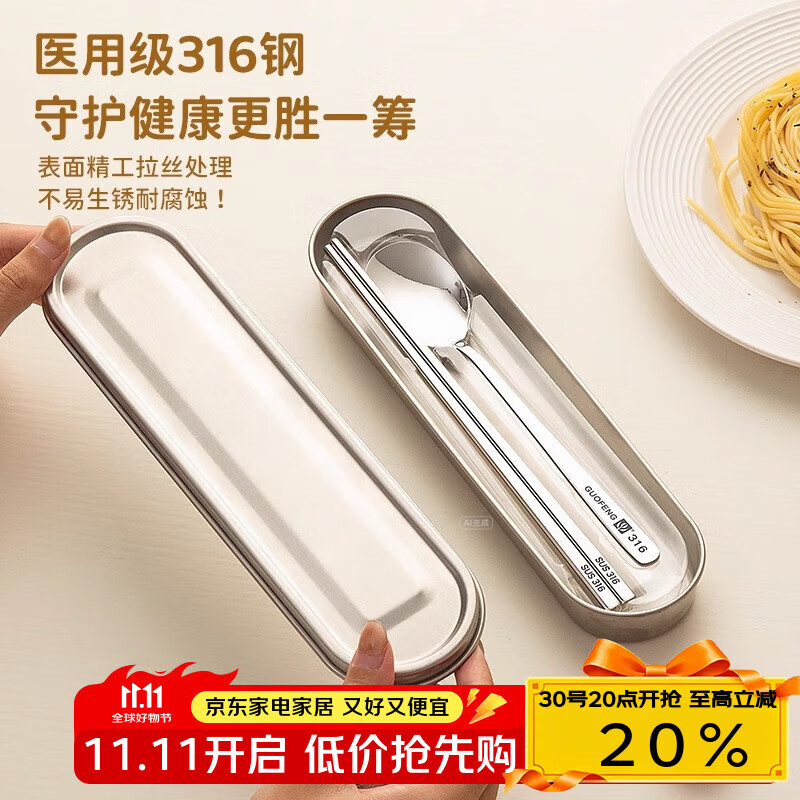 国风316不锈钢筷子勺套装学生便携餐具【316筷勺叉】+不锈钢盒+收纳袋