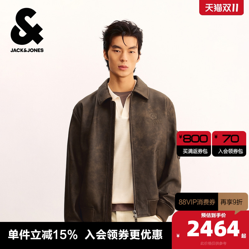 E10金棕色 165/88A/XS 杰克琼斯男装秋季新款潮流出街百搭字母刺绣翻领宽松真皮夹克外套