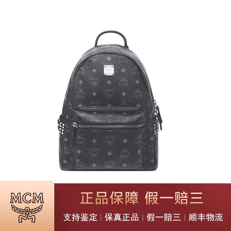 [二手95新]MCM黑色经典基础款印花侧面铆钉logo男士背包基础款大容量双肩包书包 黑色小号