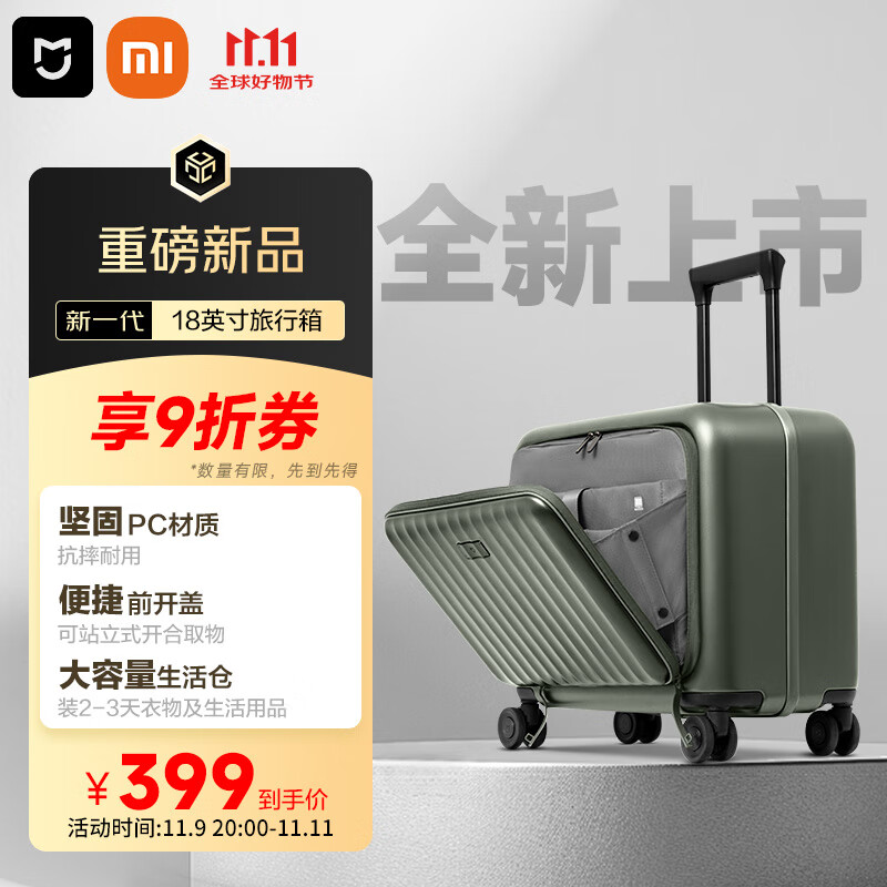 米家小米行李箱18英寸拉杆箱男女出差旅行箱前开盖密码箱远山绿