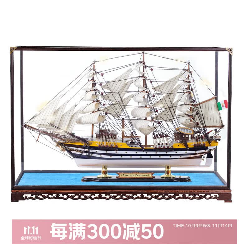 Snnei仿真实木帆船模型摆件 创意一帆风顺手工艺船 开业礼品乔迁礼物 《韦斯普琦号》52cm礼盒款+罩+灯
