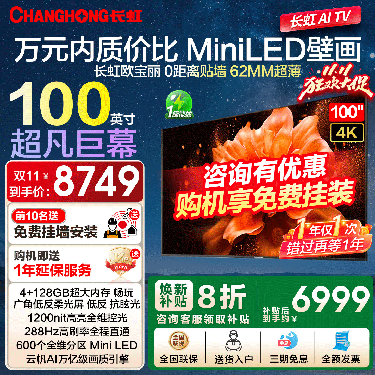 长虹欧宝丽100Z60H 100英寸MiniLED 288Hz高刷超薄液晶壁画电视机 100英寸 100Z60H烟暮灰 官方标配