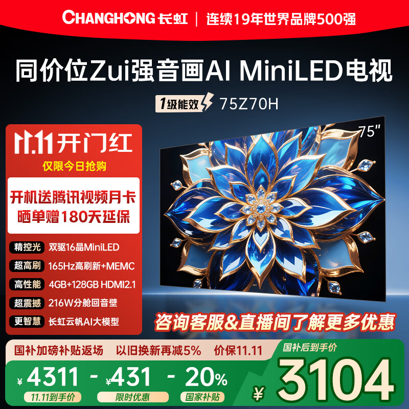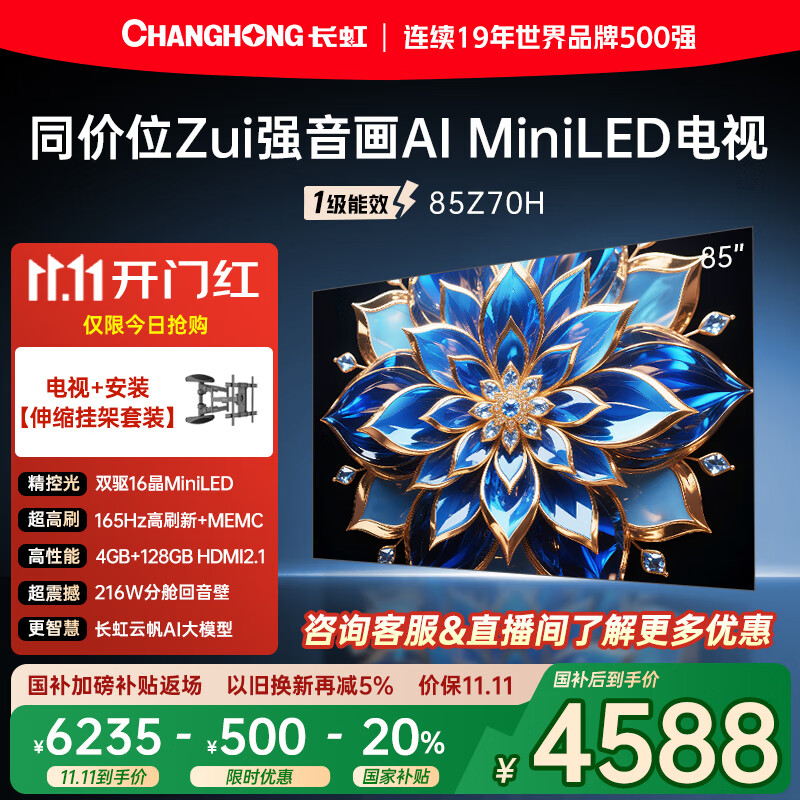 长虹欧宝丽85Z70H 85英寸【伸缩挂架送装一体版】4GB+128GB 165Hz高刷新4K超高清智能平板液晶电视机