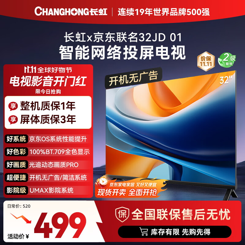 长虹京东联名款 京东OS 欧宝丽电视 32JD 01 32英寸 无开机广告 智能网络投屏电视 32Z60H