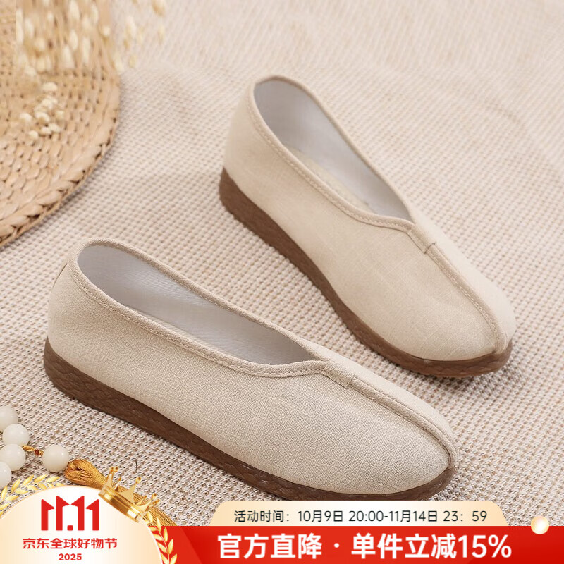 娟的绢春老北京布鞋女单鞋民族风禅修僧鞋平跟软底厚底妈妈鞋古风汉服鞋 米色 39