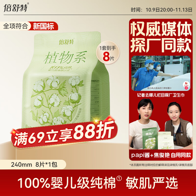 倍舒特 【papi酱同款】植物系 消毒级纯棉极薄日用卫生巾240mm8片姨妈巾