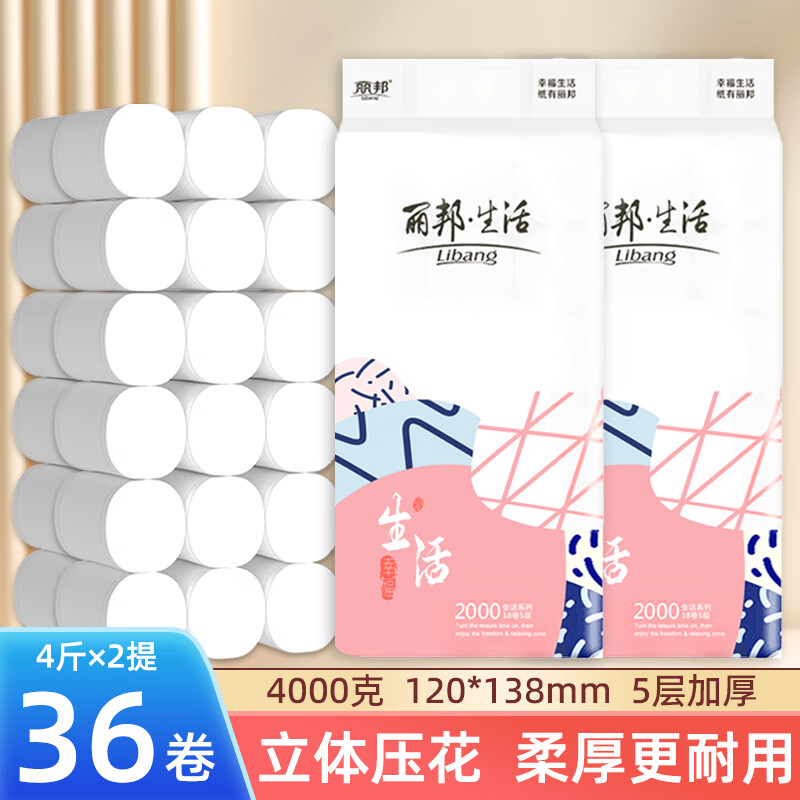 丽邦 Libang 卷纸卫生纸 5层无芯卷筒纸厕纸擦手纸巾 手纸批发 2000克X2提(8斤36卷)