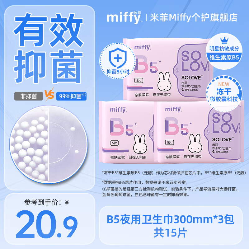 米菲Miffy卫生巾冻干B5 敏感肌可用日夜用姨妈巾透气护垫防侧漏隔边 冻干B5 抑菌夜用300mm【3包共15片】