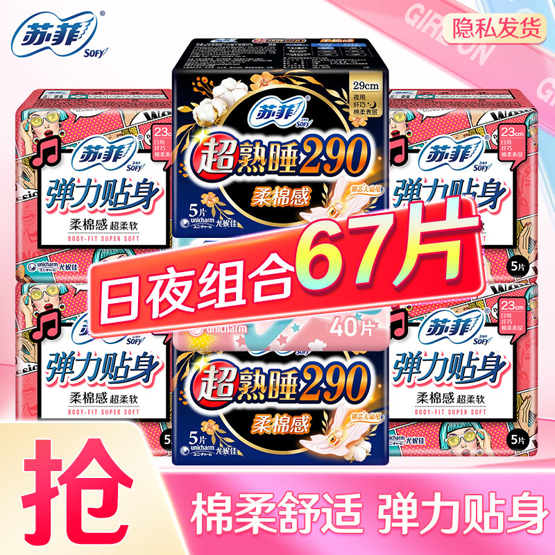 苏菲卫生巾日夜组合230+290迷你护垫140mm无香型丝薄柔滑超透气姨妈巾 超值日夜140+230+ 290mm 67片