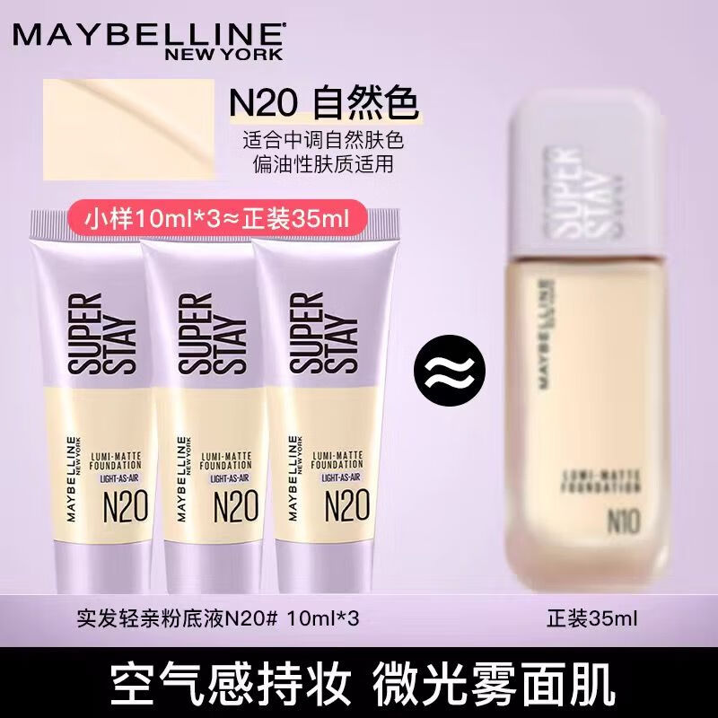 百亿补贴:美宝莲轻亲持妆粉底液小样油皮不脱妆轻薄水润服帖清透妆感遮瑕提亮女 N20自然色30ml